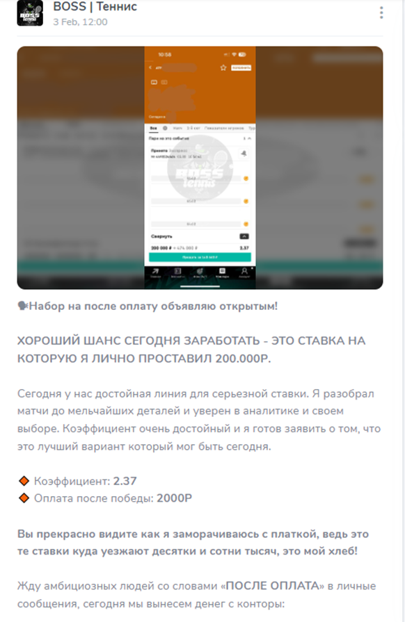 Сегодня у нас на обзоре проект «BOSS | Хоккей», основателем которого является каппер по имени Алексей (@boss_hockey). Важно отметить, что аналитик изменил название группы и теперь ее можно найти по запросу «BOSS | Теннис». Обычно к смене названия приводит наличие разоблачающих обзоров в интернете и большое количество жалоб на паблик со стороны пользователей. Также нельзя отметать вариант с покупкой ресурса другим человеком, который специализируется именно на прогнозировании теннисных матчей. В любом случае, в 2025 году данный паблик связан с предоставлением предиктов исключительно на встречи теннисистов. В описании нет ссылок на страницы каппера в социальных сетях или информации об опыте автора в мире ставок на спорт.
