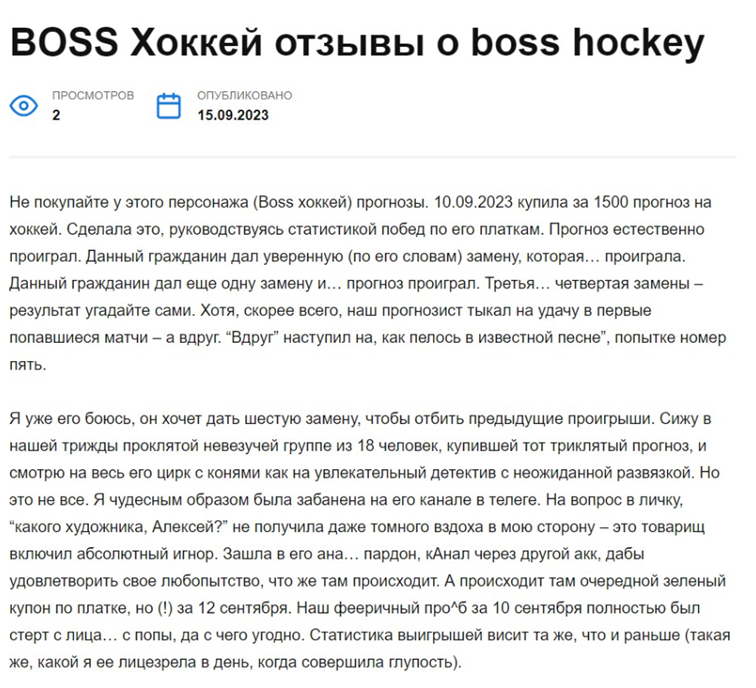 Даже если бы наш сегодняшний герой продавал ставки без постоплаты, стоимость в 2 000 рублей за прогноз просто непозволительна для абсолютного большинства людей. Безопасная игра при регулярном использовании платных предиктов от данного аналитика возможна лишь при семизначном банке. Упоминания других услуг от создателя телеграмм-канала «BOSS | Хоккей» отсутствуют. В ленте не были найдены признаки сотрудничества автора с букмекером и рекламы мошеннических проектов.