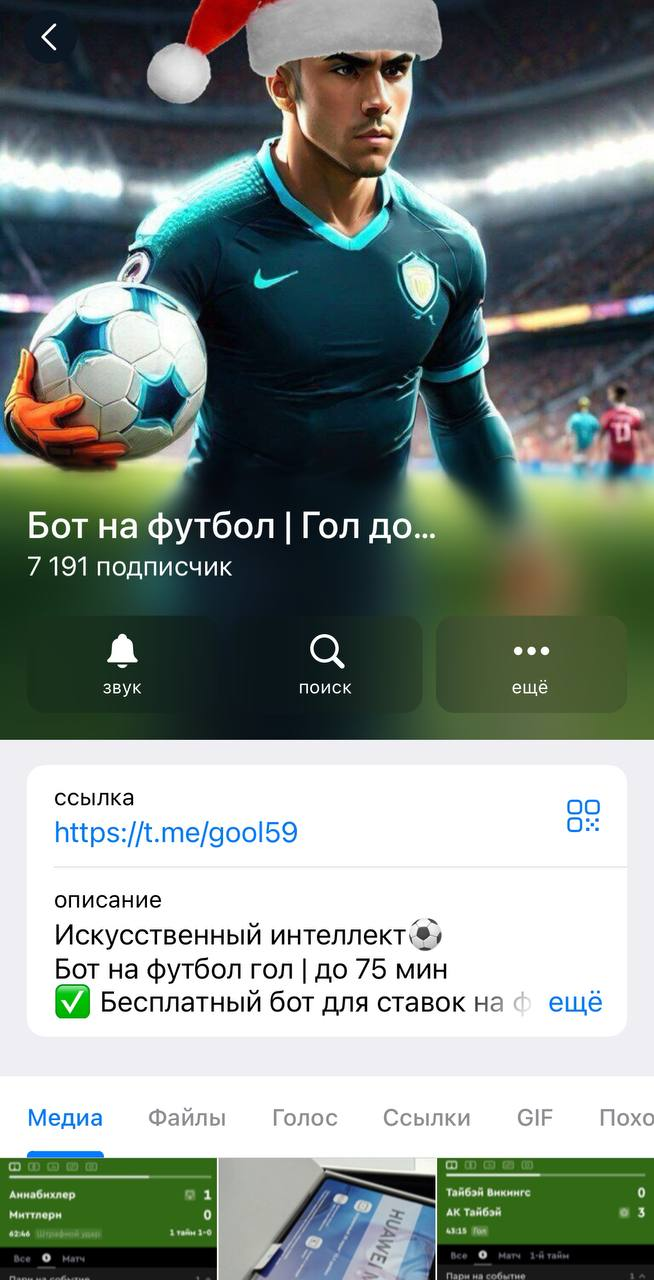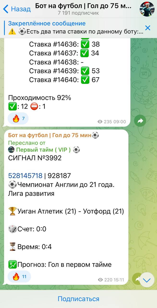 Контент в ленте канала Бот на Футбол ограничен только ставками на лайв-события. Основной упор делается на Гол до 60-й минуты и Гол до 75-й. Средние кэфы варьируются в районе 1.80. Формат прогнозов — ординары, подаваемые без аналитического сопровождения. Также присутствуют сообщения о якобы успешной работе VIP-чата, в котором используются дополнительные рынки, такие как Гол в первом тайме. Доказательств эффективности стратегии при этом не приводится.