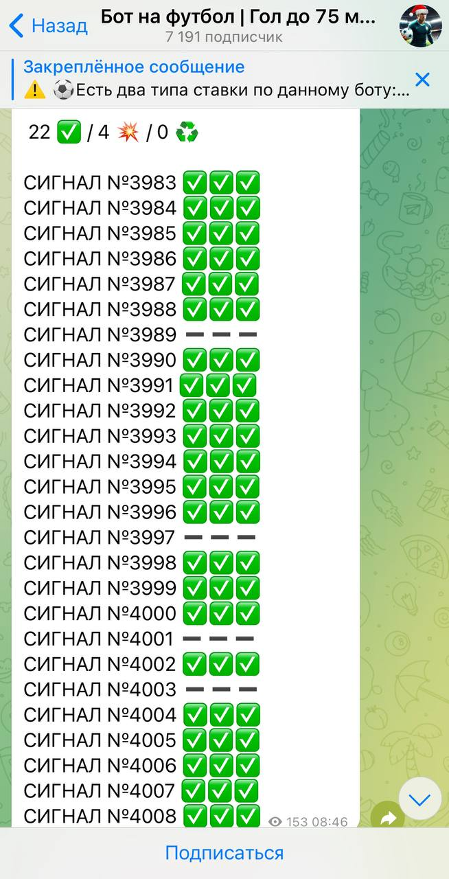 В ленте не публикуются новости из мира футбола, разборы матчей, тактика ставок или даже краткие пояснения к выбору исходов. Пари подаются без комментариев и без обоснований. Основной аргумент — работа бота, но технических деталей, структуры алгоритма или хотя бы описания логики его работы не представлено.