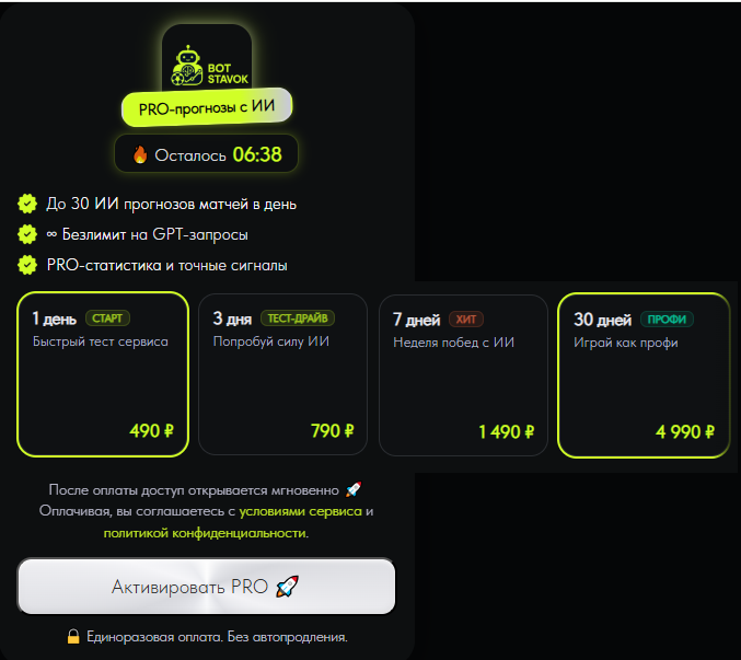 Сегменты деятельности на «Бот Ставок — ИИ в спорте» и цены на платные предложения