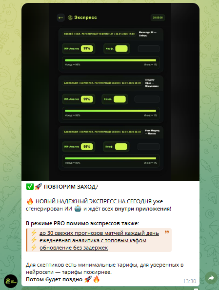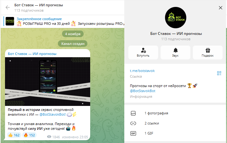 Канал в telegram «Бот Ставок — ИИ в спорте» создан осенью 2025 года, в его ленте всего три публикации, да и подписчиков всего около сотни.