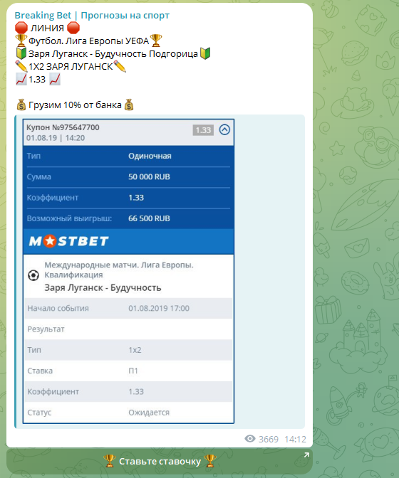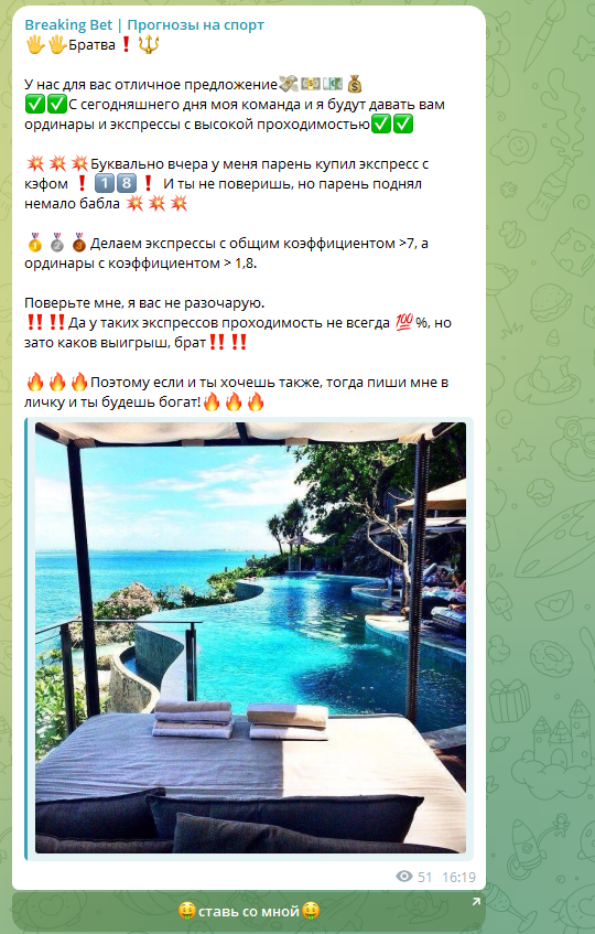Breaking Bet — это канал Владимира Новикова в Telegram. В описании проекта указано, что это не первый ресурс капера. Блог ориентирован на беттеров. В новостной ленте сообщества размещают ставки на спорт. Есть платные услуги и возможность купить экспрессы. Проект не кажется безопасным и не вызвал доверия у наших экспертов. Есть признаки развода. Мы провели проверку, чтобы определить, какая у телеграмм-канала репутация и стоит ли сотрудничать с Владимиром.