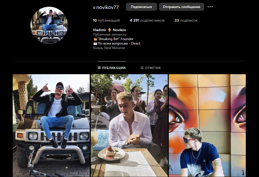 Контактов администратора на канале нет. Но есть ссылки на профиль в Инстаграм. Капер называет себя Владимир Новиков. Ник в социальной сети — @v novikov77. Однако профиль является фейком. Эти снимки мы замечали и на других страницах каперов. Личность вымышленная, пользователей пытаются обмануть. На профиль подписано больше 4,3 тысячи человек. Новые публикации не выходят.