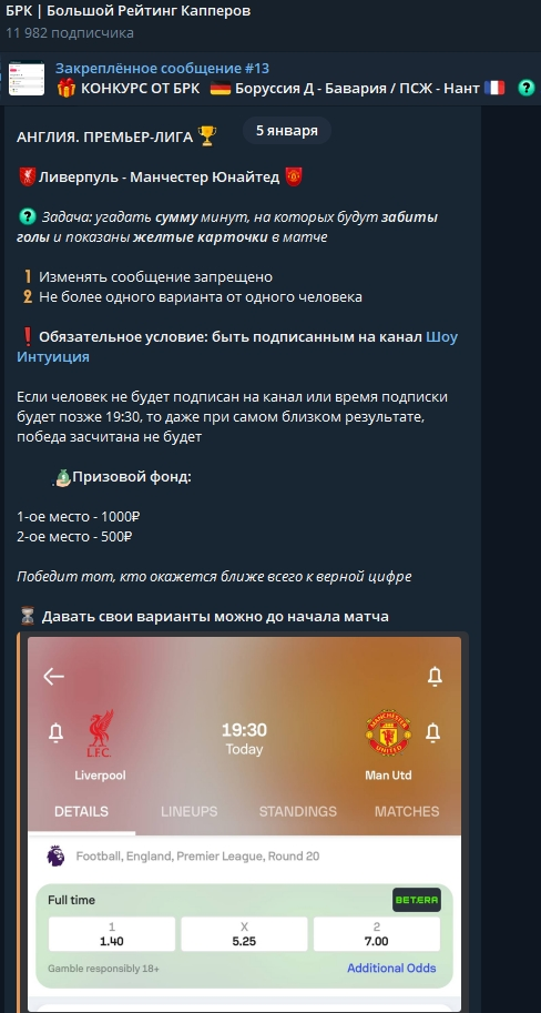В Телеграмм Большой Рейтинг Капперов периодически проводятся конкурсы, но вознаграждения минимальные, при этом надо подписаться на сторонний канал и выполнить дополнительное задание. Например, два приза 1000 и 500 рублей за подписку и угадывание суммы минут, когда будут забиты голы, показаны желтые карточки.
