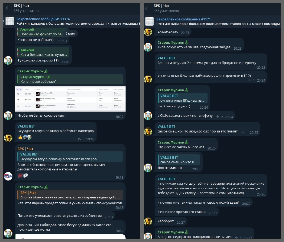 У проекта Большой Рейтинг Капперов есть чат с отзывами. В нем подписчики могут обсуждать рейтинги. В основном сообщения нейтральные, но есть негативные и жалобы.