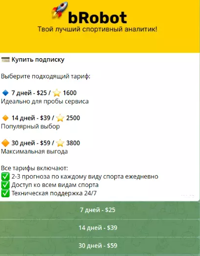 BRobot (2 350 подписчиков) предлагает платный доступ к прогнозам через telegram-бота. Пользователю обещают до нескольких сигналов в день на футбол, хоккей и другие виды спорта с коэффициентами около 1.7–2.2.