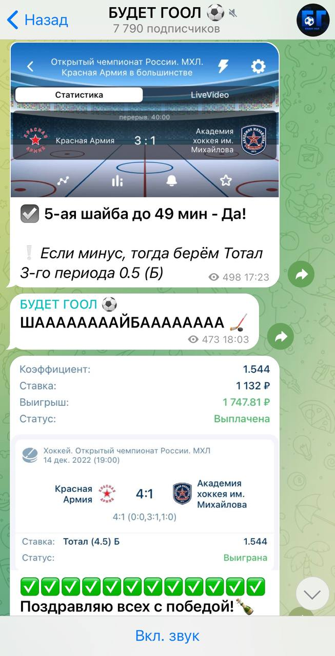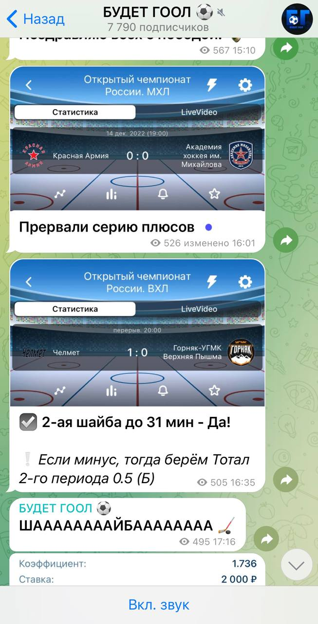 Помимо стандартных ставок, в Будет гол рекламируются раскрутка счета и подписка на ВИП-паблик, где якобы работают алгоритмы на базе ИИ. Однако никаких пояснений или описаний к ставкам на канале не публикуется.