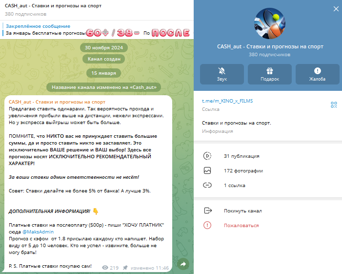 Сообщество CASH aut нацелено на аудитории беттеров, при этом его автор Максим открещивается от любых гарантий прибыли по ставкам на спорт. Есть у каппера и вариант продажи прогнозов, значит, проверка отчетов по статистике поможет игрокам в бк избежать ненужной потери средств.