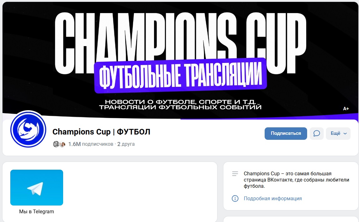 Этот проект скорее всего был фейком, маскируясь под достаточно авторитетное интернет-СМИ — большой блог в ВК Champions Cup Футбол. Аудитории этого сообщества 1,6 миллиона подписчиков. Плюс у блога есть приватный Telegram канал Champions Cup | ФУТБОЛ, со 130 000 пользователями. Канал закрыт, мы провели его анализ по Tgstat. Он пользуется хорошей популярностью у игроков и любителей спорта, там ежедневно публикуется контент о футбольных матчах.