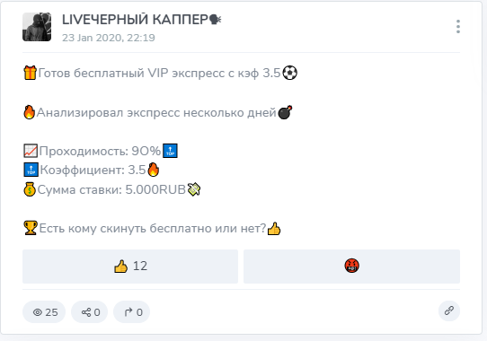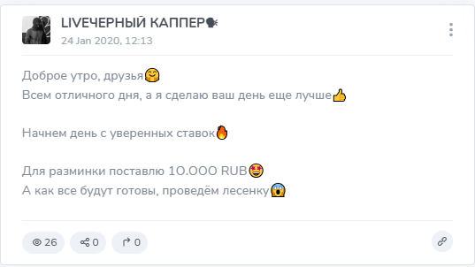 В ленте капер периодически выкладывает ординары и экспрессы по линии и в лайве. Экспресс, как он утверждает, анализируется в течение нескольких дней, однако сама авторская аналитика в ленте отсутствует. Есть советы по банку – обычно прогнозист рекомендует ставить 5000-10 000 рублей. Это подходит для беттеров с достаточно большими банками – не менее 200 000 рублей.