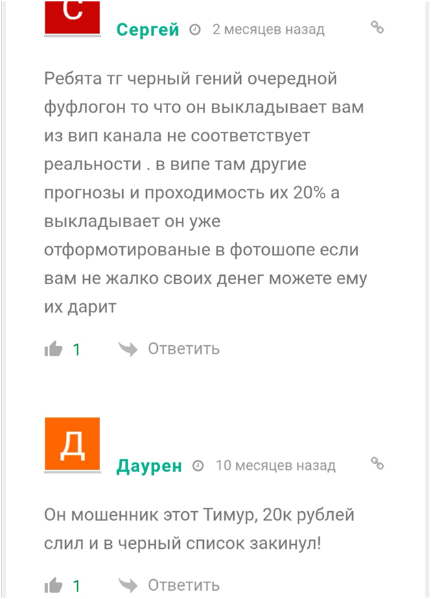В его профиле в Телеграмм по ссылке @geniy_timur видим только имя и фотографию симпатичного парня в профиль. В сети информации о таком капере нет. Упоминается он в обзорах паблика Чертов гений на специализированных сайтах. Все эксперты сходятся в одном – доверять данному аналитику нельзя.