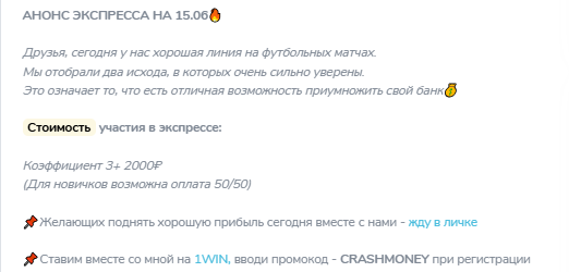 В основном Telegram Crash Money нет отзывов о капере, комментарии закрыты – ограничения связаны с нежеланием прогнозиста получать негативные отклики о своих прогнозах.