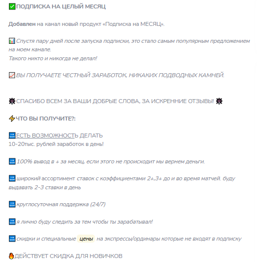 Ставки с коэффициентами 3-4 и выше, прогнозист не делится авторской аналитикой матчей, но уверенно заявляет, что его прогнозы 100% заходят без рисков. Это однозначно неправда – в беттинге нет такой стратегии, которая исключила бы все риски слива. Чтобы добиться максимальной проходимости, админ удаляет минусы из ленты.