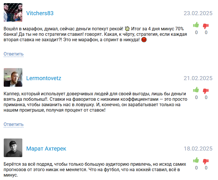 На сторонних ресурсах говорят о мошенничестве и желании обманом привлечь аудиторию, заработать на них. К сотрудничеству не советуют, прогнозист не разбирается ни в одном виде спорта, который анализирует.
