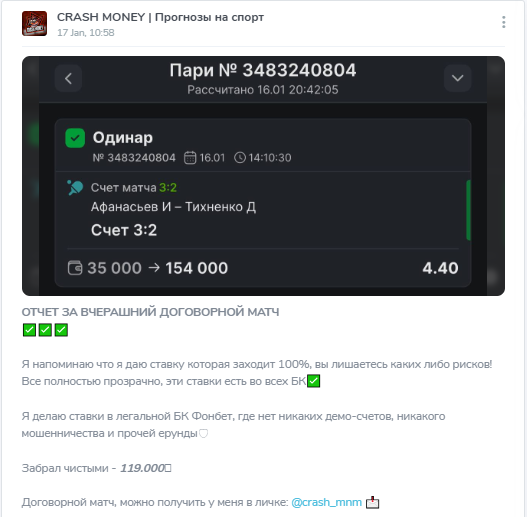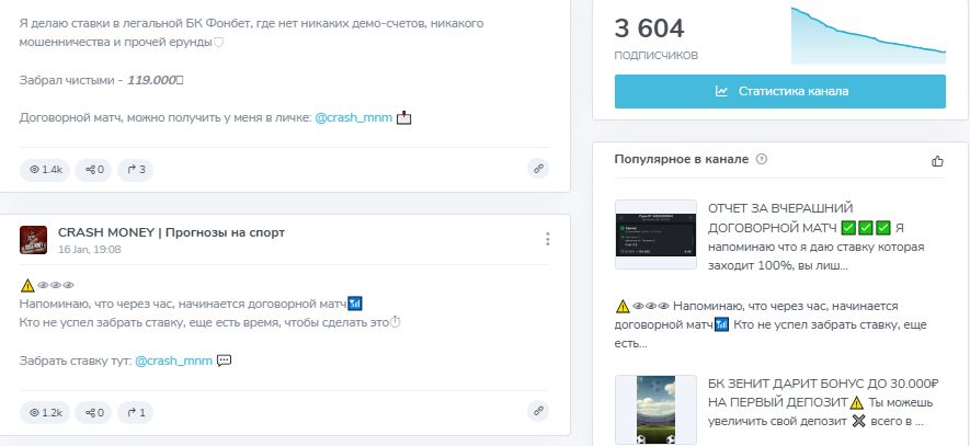 Деятельность канала Crash Money со ставками на спорт
