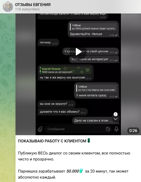 Евгений открыл отдельный ТГ с отзывами, но писать в него нельзя. Админ группы публикует скрины и экранные видео переписок с благодарностями клиентов.