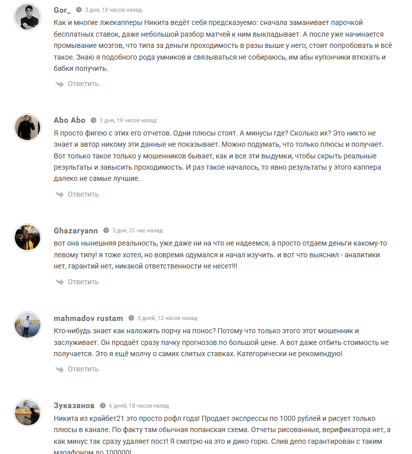 Капер использует профиль Nikita (Crybet21) для взаимодействия с подписчиками. Информации о его опыте, ROI и других результатах нет, что ставит под сомнение его репутацию эксперта.