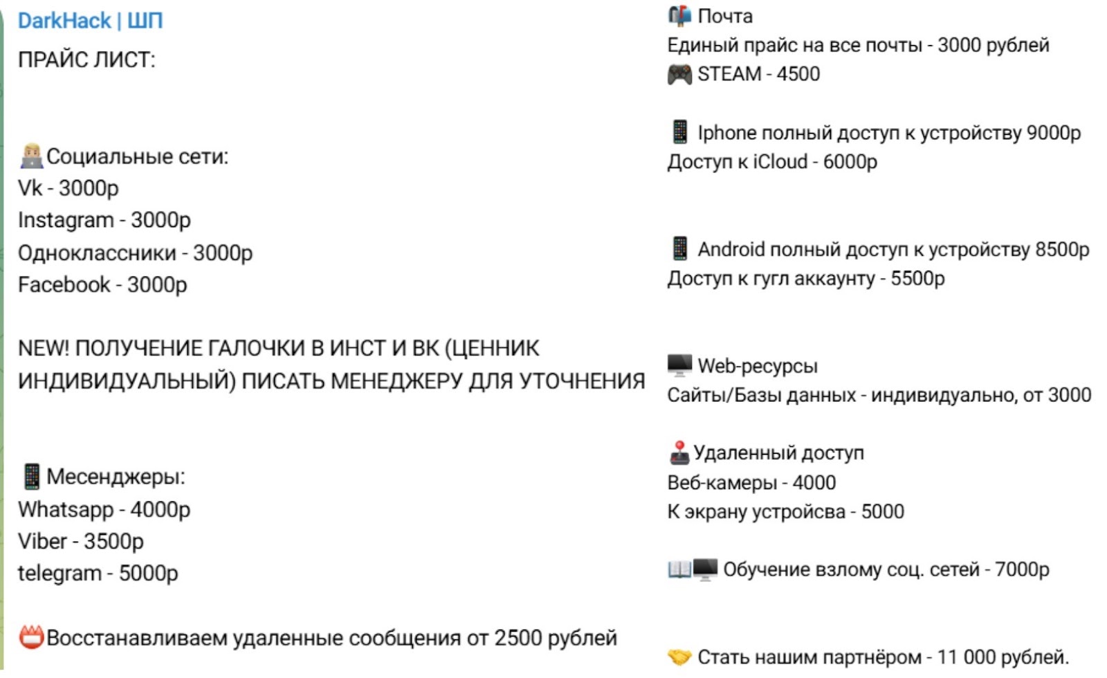 В DarkHack со взломом социальных сетей опубликован подробный прайс лист на каждую услугу. Цены: