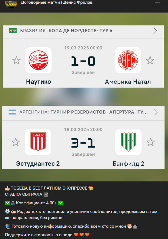 Контент выстроен по шаблону: платные прогнозы на точный счет, отчеты с «успешными» ставками, иногда — бесплатные предикты. Автор не разбирал матчи детально. Все упиралось в «это договорняк, инфа сотка». А если предикт не заходил, Фролов придумывал сказки про «перекупленный матч» или «вмешательство букмекеров». Очень удобно: Денис прав в любом случае.