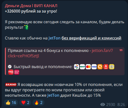 Деньги Дома Вип Канал — проект в Telegram, созданный спортивным аналитиком. В рамках сообщества подписчикам предлагают легкий способ заработка. Заявляется, что прогнозист бесплатно делится ставками с аудиторией. Нужно лишь регистрироваться на сайте рекламируемой букмекерской конторы и заключать пари. В этой схеме прослеживаются признаки мошенничества. Наши эксперты провели проверку, чтобы определить уровень безопасности проекта. Вы узнаете, какие реальные условия сотрудничества с этим телеграм-канала и какая репутация у капера.