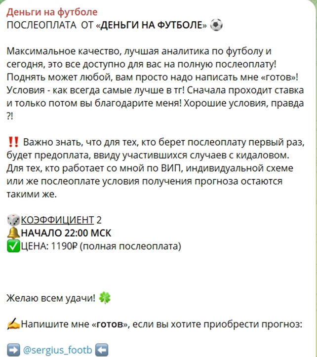 В качестве платной услуги в проекте автор предлагает беттерам приобрести ставку с котировкой около 2.0. за 1 190 рублей. Однако платить нужно не сразу, а только после завершения пари в пользу подписчика. Такая схема по итогу поможет заработать только капперу, ведь ему ничего не мешает предоставлять клиентам отличающиеся предикты на один и тот же матч. Таким образов недобросовестный аналитик гарантирует себе получение прибыли, а участники сообщества на дистанции потеряют весь депозит. Других услуг автор не оказывает. Неоднократно подчеркивалось в обсуждениях, включая отзывы телеграмм капера прогноз мастера, что подобные капперы используют одни и те же уловки.