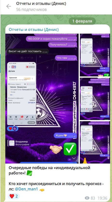 Отзывы о телеграмм-канале «Денис Успешный ставочник»: анализ, качество прогнозов каппера Den_man1