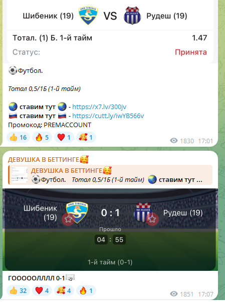 - тг-канал выкладывает бесплатные прогнозы без сильного анализа, лента заполонена ставками на тотал больше по низким кф;