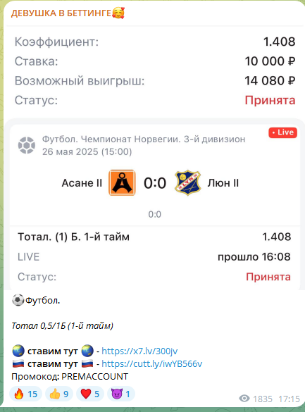 В любом случае, разводом аудитории автор не занимается, известных в telegram схем мошенничества не применяет. Канал живет на средства от рекламы бк и капперов.