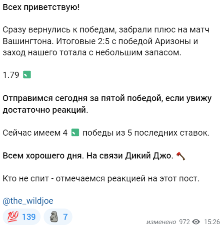 В итоге: никакого доверия к The Wildjoe быть не может. Это был очередной телеграм-каппер, который пытался заработать на неопытных пользователях. Но как показала практика, без подтвержденной статистики, честности и профессионализма далеко не уедешь — особенно в беттинге.