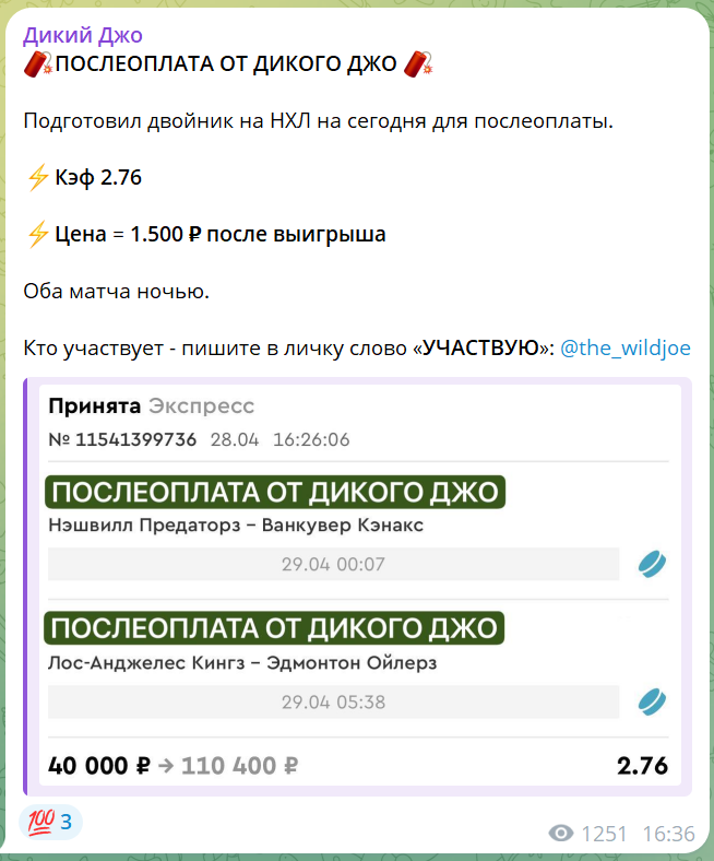 Помимо основного канала, был еще альтернативный — с экспрессами. Но и там ситуация не лучше: The Wildjoe публиковал ставки на спорт без внятного анализа. Прогнозист также забросил второй канал — аудитории он не зашел.