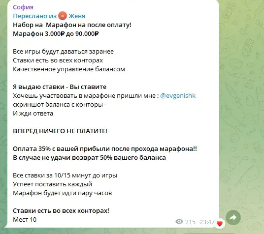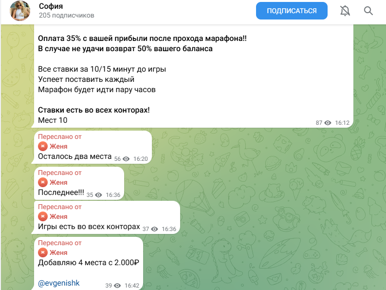 В канале @marafons9201 нет рекламы букмекерских контор. Его владелец зарабатывает при помощи своей мошеннической схемы. Он предлагает покупателям марафоны. Они заключаются в том, что капер дает прогнозы, пока клиент не поднимет свой баланс до определенной суммы. После этого ему нужно будет отдать 35% прогнозисту. Возможно, в личных сообщениях он склоняет клиентов регистрироваться по реферальной ссылке в БК. Это нужно, чтобы получать прибыль от каждого проигрыша.
