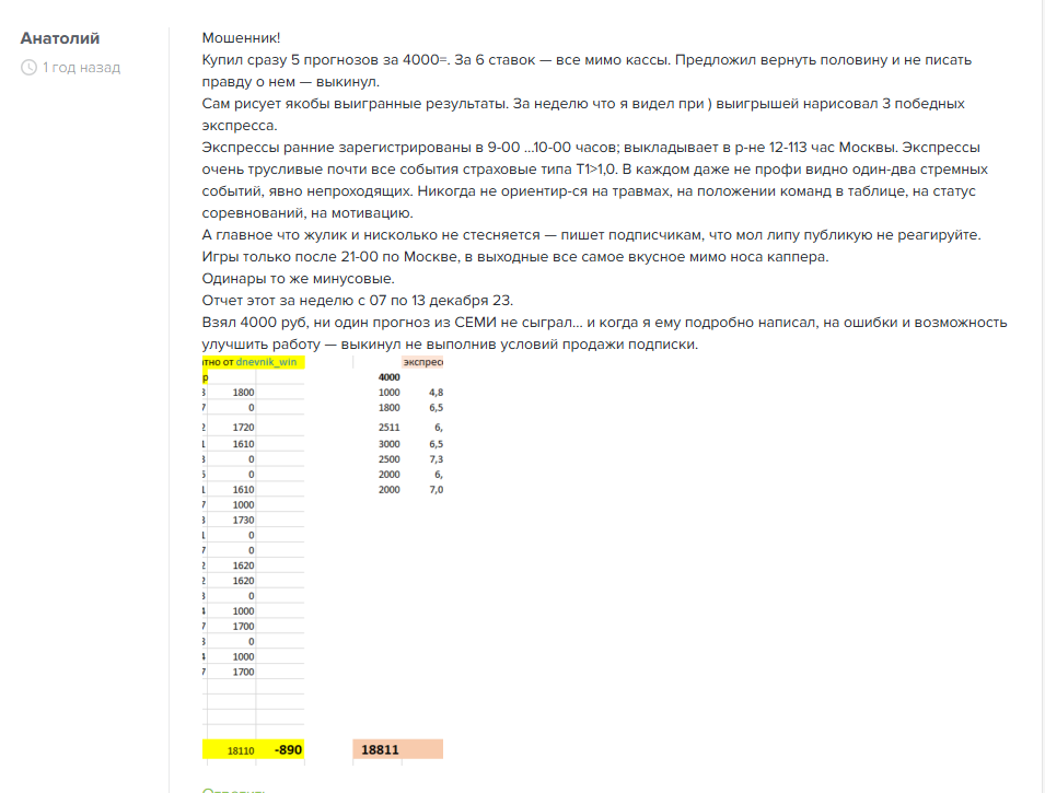 На независимых площадках преобладают негативные отклики. Пользователи отмечают, что купленные экспрессы не заходят, статистика подделана. А каппер не несет ответственности за потери. Прогнозы выбираются наобум, а прогнозист уходит от общения при возникновении претензий.