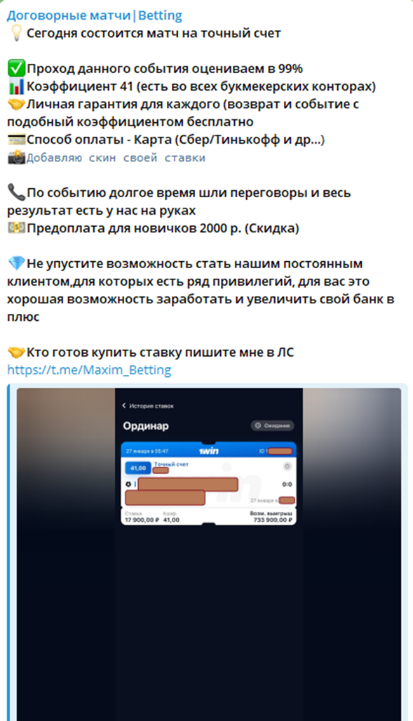 «Договорные матчи | Футбол» - так называется сообщество в телеграмме, в рамках которого беттерам предлагают заработок на подставных играх между футбольными командами. Аналитик Максим Кашкин называет себя инсайдером и утверждает, что располагает информацией о предстоящих встречах между футбольными клубами, в которых исход и счет известны заранее. Автор предлагает прогнозы только на футбол, другие виды спорта в проекте не упоминаются.