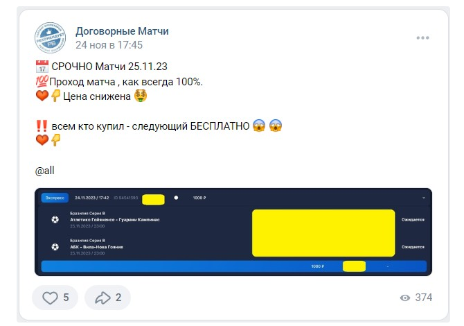 Деятельность группы Вконтакте Договорные матчи