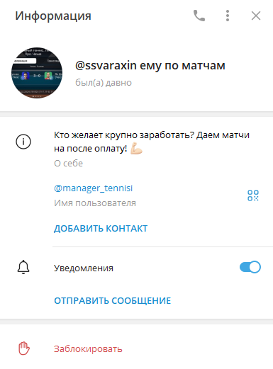 Основной контакт — @manager_tennisi. Альтернативный — @ssvaraxin: его можно найти в еще нескольких похожих каналах. Думаем, вся эта история — дело рук одной команды, которая создает однотипные проекты с разными названиями.