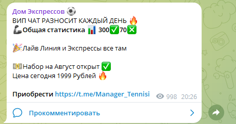 Основной источник заработка — ВИП-чат. Цена — от 1 999 рублей. За эти деньги клиент получал доступ к лайв-ставкам, линии и экспрессам. Но, конечно, без гарантий — только обещания, что «будет жир».