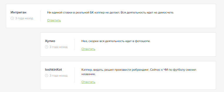 На сторонних площадках проект никак не упоминается. Ни в авторитетных рейтингах, ни в базах верификаторов. На форумах тоже тихо. Лишь под парой обзоров удалось найти негативные отзывы: люди пишут, что прогнозы не заходят, статистика не ведется, все похоже на типичный скам.
