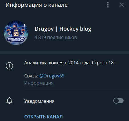 Drugov | Hockey blog — сообщество в Telegram, где вы найдете ставки на спорт. Автор здесь публикует ординары и экспрессы по хоккею. Капер заявляет о профессиональном подходе, но реальная статистика, доверие аудитории и репутация каппера вызывают серьезные сомнения.