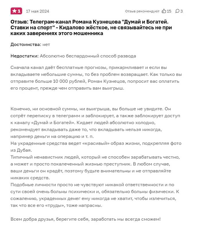 Проверка канала со ставками Думай и богатей: оценка услуг каппера Романа Кузнецова в Телеграме, отзывы его клиентов