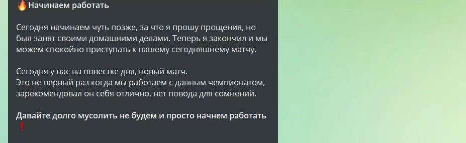 В ленте ежедневно публикуются одиночные прематч-ставки на исходы и тоталы. Автор заявляет, что все прогнозы строятся на «внутренней информации», которую он якобы получает от представителей футбольных клубов.