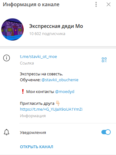 Экспрессная дяди Мо – это Телеграм-канал, каппера Михаила. Он же Дядя Мо (@moedyd). Паблик создан 2 года назад. Его автор специализируется на предиктах на турниры НХЛ, АХЛ и КХЛ. Каппер активно сотрудничает с БК, размещая реферальные ссылки и промокоды. За регистрацию новых пользователей и их ставки он получает комиссию. Также владельцем проекта размещаются ссылки на @stavkii_obuchenie и @chat_stavkii_nasort. Мы проанализируем деятельность прогнозиста и сделаем выводы о том, стоит с ним сотрудничать или нет.