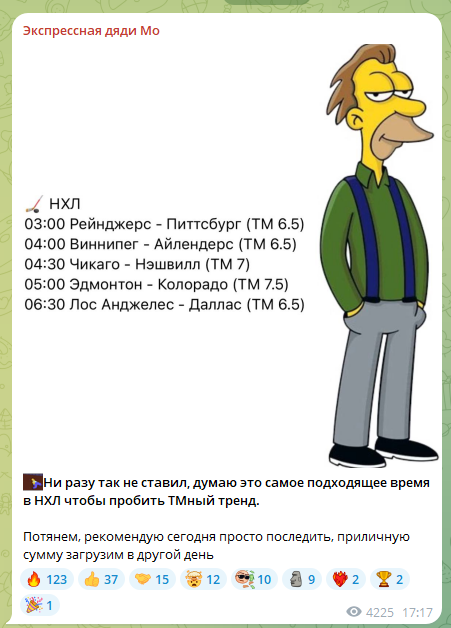 На данный момент канал насчитывает около 6800 подписчиков. Аудитория реальная. Посты просматривают 4000+ человек. Это плюс. Контент канала @moedyd оформлен в стилистике мультсериала Симпсоны, что добавляет элемент узнаваемости и определенной привлекательности для игроков. Каппер ежедневно публикует прогнозы на хоккейные события. Но они зачастую представляют собой только текстовые списки матчей и скрины купонов с предполагаемыми исходами.