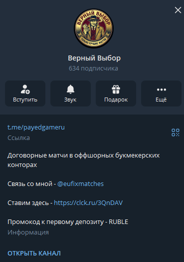 Прогнозисту принадлежит ТГ-канал Верный выбор (Payedgameru). Его аудитория — немногим более 600 игроков. Активна примерно половина подписчиков.