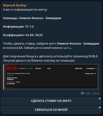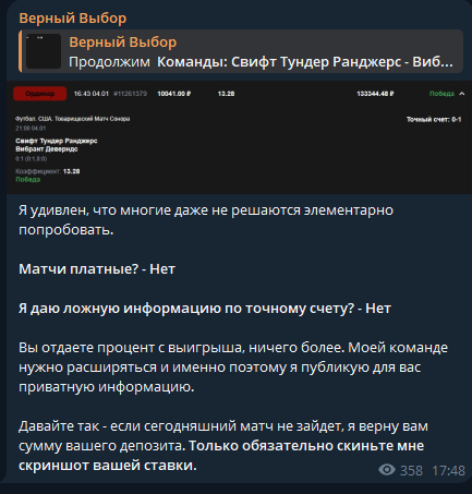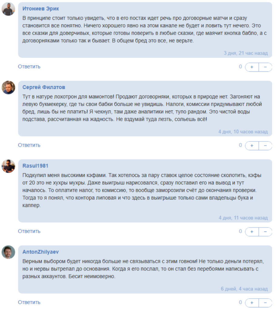 Раскруток банка, ВИП чатов, экспресс ставок аналитик не предлагает. Каждый его пост дополняется ссылкой на БК. Это не реклама, поскольку при переходе по ней пользователь оказывается на мошенническом сайте. Когда игрок пытается вывести деньги, с него требуют оплату комиссий, налогов и прочего. При отказе от них клиента блокируют.