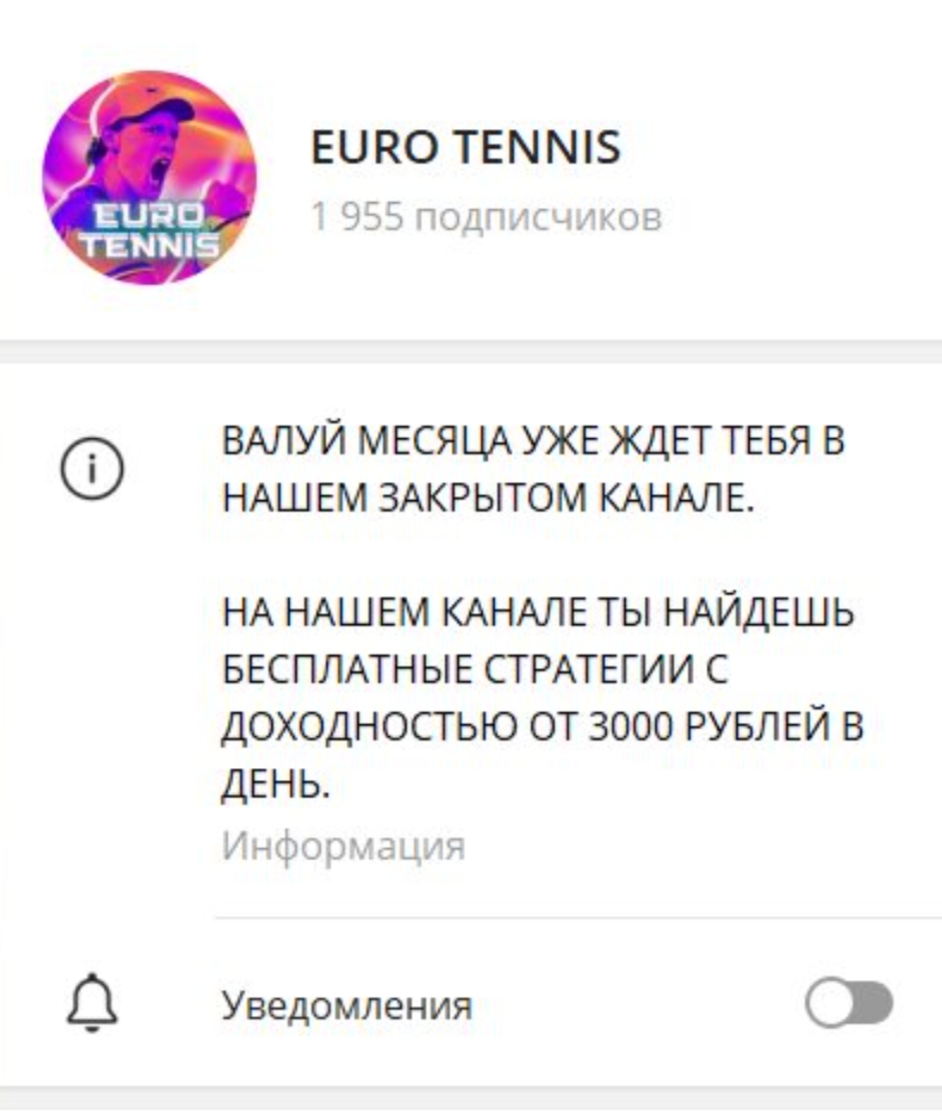 В Telegram канале Euro Tennis нет информации о поштучных платных экспрессах и ординарах. Админ упоминает про ВИП чат, но не называет цену подписки, не рассказывает о подробных условиях и гарантиях, которые получают игроки в случае слива банка.