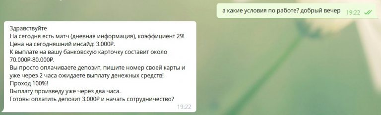 Формат предложений однотипен: вклад от 3000 рублей с гарантией возврата в случае проигрыша и обещанием выплаты 70–80 тыс. рублей при успехе. Играется якобы один матч в день. Однако публичных доказательств ни ставок, ни выплат не приводится. Подобные обещания прибыли часто используются в схемах с раскруткой депозитов, которые являются популярным вариантом развода в Телеграме.