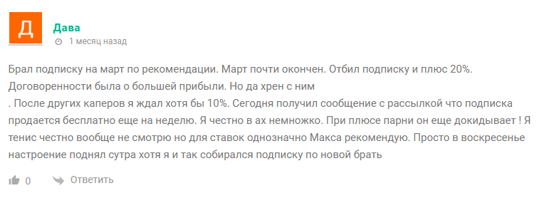 Есть пользовательские отзывы — в целом нейтральные. Беттеры утверждают, что проходимость не дотягивает до заявленного им в переписке уровня, но какую-то прибыль на дистанции в месяц получить можно.