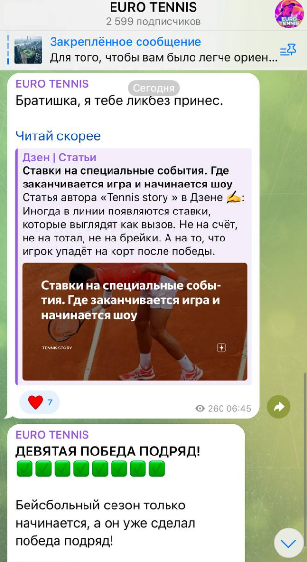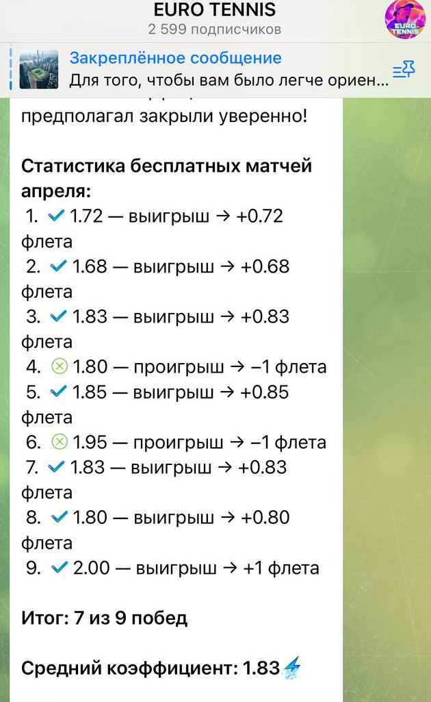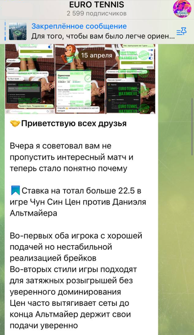 В Telegram-канале прогнозист предлагает пользователям предикты на теннисные матчи. Другие виды спорта в ленте не обнаружены. Это вызывает определенное доверие — работать с единственной дисциплиной гораздо легче, чем со многими одновременно. Подробное разоблачение покажет, занимается ли каппер мошенничеством.