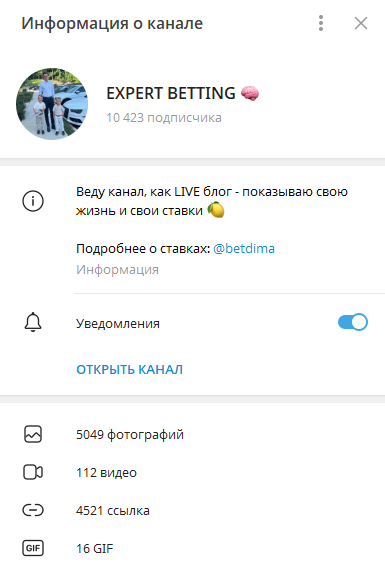 Канал создан 27 ноября 2020 года, на момент анализа на него подписано более 10 000 пользователей. Контент ленты Expert Betting состоит из платных анонсов ставок, рекламных постов и скриншотов с якобы выигравшими купонами. Бесплатные прогнозы отсутствуют полностью. Упор делается на продажу экспрессов и индивидуальных прогнозов по высокому коэффициенту. Но Дядя Дима не публикует каких-либо разборов, аналитики или методик.
